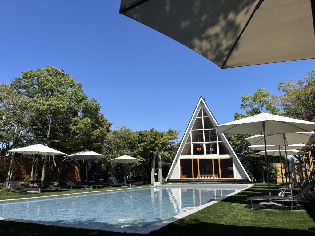 出てすぐにシャワーを浴びれば、水風呂代わりに目の前のプールにダイブ!!見上げれば青空…。