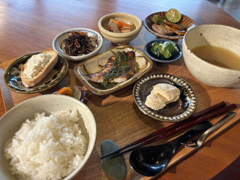 小鉢が多いの嬉しい〜♪地元のお豆腐千田豆腐とマスカルポーネチーズを合わせた白あえや、にんじんの葉っぱを使ったジェノベーゼソースがかかった豚ロースのグリルなどなど、地元の食材を堪能できるお料理の数々♪体にも良さそうなのが、お部屋も相まってデトックス〜〜〜♪