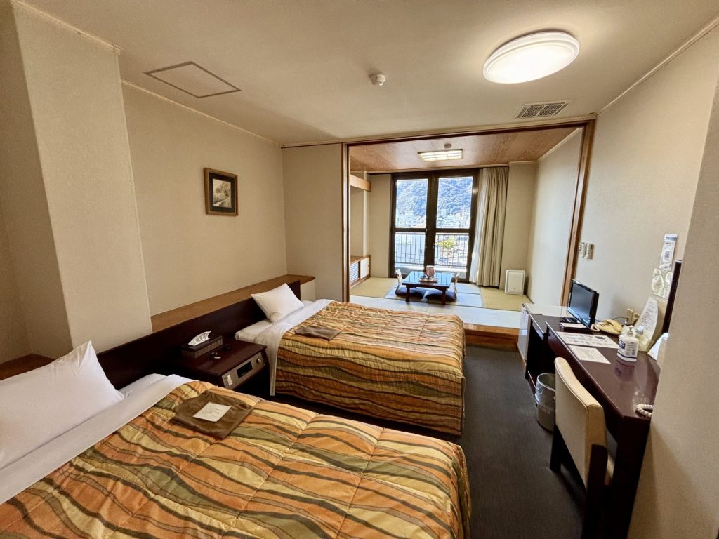 こちらは広々ベッドとゆったり和室が両立する和洋室!シンプルにお部屋の広さが抜群!
